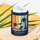 Personalized navy blue beach can coolers for your family trip to Hawaii, Florida, or other tropical island destinations. Cool palm trees sway against retro colours of orange and yellow above your customized vacation name in white script. Matching keepsake gifts are great for a group going on a cruise or coastal getaway.