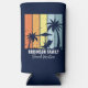 Personalized navy blue beach seltzer can coolers for your family trip to Hawaii, Florida, or other tropical island destinations. Cool palm trees sway against retro colours of orange and yellow above your customized vacation name in white script. Matching keepsake gifts are great for a group going on a cruise or coastal getaway.
