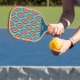 A retro blue and red pattern decorates this pickleball paddle. Personalize it with the name of your choice. Make a fun gift.