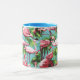 Nostalgic and cool design in bright graphic colours featuring pink flamingoes and green palm trees against a deep sky blue background.