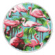 Nostalgic and cool design in bright graphic colours featuring pink flamingos and green palm trees against a deep sky blue background.