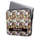 Cool laptop case printed with a hand drawn pattern of skeleton skulls wearing white chef hats, surrounded by red roses, playing cards and kitchen knives