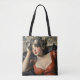 A steampunk tote with two different steampunk illustrations. One side shows a woman in a red dress sitting in a chair. Her hand holds gears. The other side of the tote has a different steampunk woman in a red dress, who also wears gears on her head.