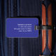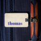 Cool fully customizable luggage tag design with bold blue name and texture beige/blue background.
