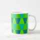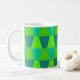 This mug has a Bauhaus design of repeating trapezoids in shades of blue and green.