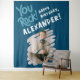 This vibrant navy blue background tapestry bursts with playful energy, featuring the bold "You Rock" in pastel blue brushstroke lettering, positioned in the top left corner. The "Happy Birthday" text, written in a fun, youthful white brush script, adds a joyful vibe nearby. In the centre, there's a customizable photo area framed within a playful brushstroke shape. You can personalize it with the birthday person’s photo, name, and date, making it unique and lively. It’s the perfect way to welcome guests to a birthday celebration, creating a festive atmosphere with fun, colour, and personal touches!