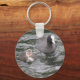 This awesome keychain features a photograph of a Coot and her chick swimming on a tidal river. The female is grey with a white patch on her head and red eyes, while the tiny fluffy chick is pale grey with a white front.