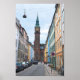 This narrow street that bisects the Copenhagen City Hall are crowded with cars, bicycles and sidewalk cafe tables. Narrow three- and four- story colourful buildings line each side of the street.