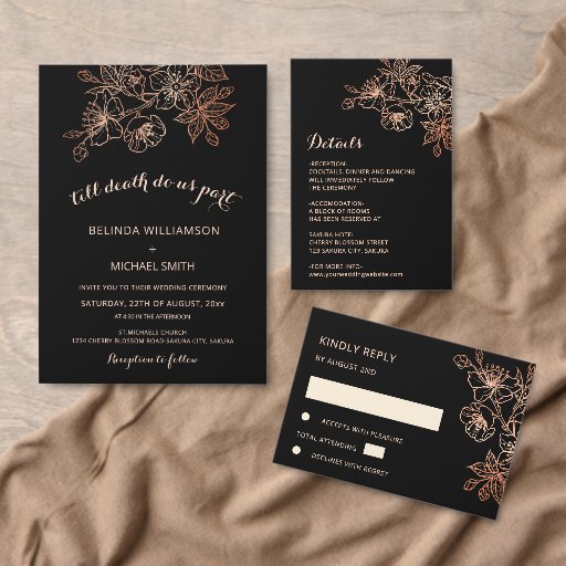 Copper floral line art cherry blossoms on a black background. Matching wedding invitation available.
