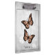 Jot down notes and reminders on a secure surface with a Copper Butterfly Floral Personalized Clipboard. Clipboard design features a pair of vibrant butterflies resting on a white floral vine against a light grey grunge background. Additional gift items available with this design as well as a variety of colours.