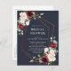 Modern and trendy, this bridal shower postcard invitation design features a faux copper geometric embellished with watercolor eucalyptus greenery and burgundy and pink floral arrangements, over a modern navy blue texture. Perfect for modern brides! Copyright Elegant Invites. All rights reserved.