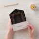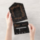 Copper glitter pine frame with cone confetti black winter Christmas wedding All in One Invitation. A lovely wedding design that includes a copper pine frame with cone and needles and confetti on black background. The tear-off RSVP card is detachable.