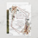 Modern and trendy, this gorgeous winter wedding invitation design features a faux copper geometric embellished with beautiful winter watercolor greenery, berries, pine cones, and tiny flowers. The couple's names and some wedding details are in a matching pine cone colour. The back of the card features your favourite engagement photo. Copyright Elegant Invites, all rights reserved.