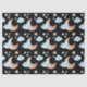 Fun digital patter features copper coloured moons and stars with fluffy blue clouds on black background.