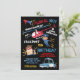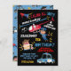 Super cute Cops and Robbers birthday party invitation with fun funky fonts. Features a police man hanging like a superhero from a helicopter, holding a doughnut, a robber or escaped inmate with a bag of cash, handcuffs, megaphone and police car.