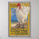 Affiche de voyage vintage ornée d'un grand coq blanc debout fièrement sur fond de scène ensoleillée avec des cabanes de plage colorées. Le texte en français et en néerlandais est affiché en bonne place autour de l'image, faisant la publicité de diverses activités et commodités de loisirs à Coq-sur-Mer (De Haan). Publié en 1923 en Belgique. Veuillez noter que nos affiches sont des reproductions de haute qualité basées sur des scans professionnels, très haute résolution des originaux. Notre processus de retouche manuelle n'implique pas l'utilisation de filtres qui enlèvent les détails ou la texture d'origine que vous verrez dans les impressions d'origine. Tous les détails restent intacts. Couleurs corrigées. Imperfections supprimées. Photo publiée avec l'aimable autorisation de Library of Congress.