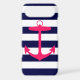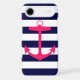 Une silhouette rose néon d'une ancre est sur un arrière - plan rayé bleu marine et blanc. Un design nautique amusant.