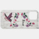 Personnalisez ce coque iphone de colibri unique "One of a Kind" ! Il présente un colibri adorable sirotant le nectar de grandes fleurs roses et violettes...Sur un Arrière - plan en bois stressé ! Peinture d'art original par l'artiste Kerry Miller.