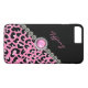 coque glamour iPhone 7 Plus fait en noir, avec une impression en jaguar rose et noir tacheté en diagonale sur le côté inférieur droit du coque. Les graphismes d'une bordure en diamant, à la lisière de l'empreinte jaguar, ont un joyau rose et argent, au milieu. Personnalisez le texte rose pour vous-même ou comme une idée cadeau ciblée.