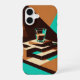 A modern, minimalist depiction of an espresso cup using abstract, geometric shapes in a warm vintage color palette.