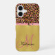 This modern phone case has hot pink and black leopard print against gold foil on top and solid gold foil on the bottom. The two are separated by a faux pink belt. At the bottom you personalize it with your name and initial of your last name.