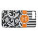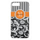 Ce coque personnalisé en noir et blanc Coque-Mate personnalisé iPhone 7 a un damas floral et rayé arrière - plan motif avec une bande et un cercle orange et blanc pour ajouter votre nom, initiales, monogramme ou autre texte à. Ce nouveau coque moderne et branché fait une déclaration chic pour le jeune fashionista branché ! Si vous avez besoin d'aide, envoyez un courriel à niteowlstudio@gmail.com.