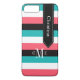 Ce coque personnalisé noir, blanc, bleu turquoise, et corail rose Coque-Mate iPhone 7 a un large motif arrière - plan rayé gras et un ruban bannière noir avec couture blanche à laquelle vous pouvez ajouter votre nom, initiales, monogramme ou autre texte. Ce nouveau coque moderne et branché fait une déclaration chic pour le jeune fashionista branché ! Si vous avez besoin d'aide, envoyez un courriel à niteowlstudio@gmail.com.
