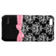 Boîtier élégant iPhone 5C, avec un motif damassé noir et blanc, sur le dessus du coque et un arrière - plan noir solide, sur le fond. Des graphiques d'un joli ruban et d'un arc roses traversent le coque entre les deux arrière - plans. Le texte de script rose, en bas, est prêt à être personnalisé. Joli moyen de protéger votre iPhone 5 et d'avoir l'air élégant aussi, et fait une excellente idée cadeau personnalisée. Choisir un fini mat ou brillant sur ce coque magnifique.