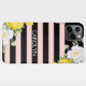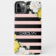 Joli design floral de roses blanches et jaunes contemporain sur un motif de rayures noir et rose vif. Avec place pour customiser ou personnaliser avec un nom, monogramme ou initiales de votre choix. Belle, élégante et élégante couverture pour le brancheur tendance et amateur d'art branché, amoureux de motifs artistiques qui veut protéger leur téléphone de la poussière et de la saleté, l'usure et la déchirure. Cette conception est disponible en coques de téléphones cellulaires Apple iPhone 6, 7 et 8 Plus, 10 ou X, XR, XS, 11, 12, 13 Mini, 14, 15 Plus et Pro Max. Montrez votre style, regardez à la mode et sentez élégant avec un design unique sur un appareil mobile de votre choix.