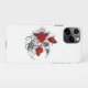 Contour, lune de croissant mécanique avec des engrenages, décoré de roses rouges avec des tiges noires spirées et feuilles sur arrière - plan blanc. Steampunk