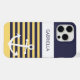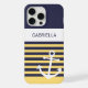 Simple ancre contemporaine de navire, sur un classique et chic bleu marine et léger motif à rayures jaune ensoleillé estival. Avec espace pour personnaliser ou customiser avec un nom, des initiales ou un monogramme de votre choix sur un arrière - plan de couleur blanche. Belle couverture moderne et cool pour le brancheur tendance et amateur d'art branché, amoureux de motifs artistiques qui veut protéger leur téléphone de la poussière et de la saleté, de l'usure et de la déchirure. Cette conception est disponible en coques de téléphones cellulaires Apple iPhone 6, 7 et 8 Plus, 10 ou X, XR, XS, 11, 12, 13 Mini, 14, 15 Plus et Pro Max. Montrez votre style, regardez à la mode, et sentez élégant avec un design unique sur un accessoire mobile de votre choix.
