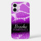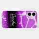 Un coque iphone à motif animal brillant dans les tons noir et violet audacieux. Personnalisez cet objet avec votre nom complet. Voici l'exemple actuel : Brooke Marshall. Ce motif original est basé sur le motif trouvé sur une girafe avec un moiré mi-teint point gain motif superposition. Art original et design par Sarah Trett pour www.mylittleeden.com sur zazzle.