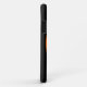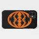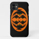 Ce coque iphone impressionnant présente un ovale orange avec six corneilles. Chaque corbeau a des yeux jaunes avec des élèves noirs et des ailes étirées. Les corbeaux volent vers l'autre formant une forme ovale. L'arrière - plan est noir.