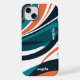 Ce capot de téléphone portable moderne et élégant présente un design dynamique et énergique avec une série de lignes audacieuses et radicales en turquoise, orange, blanc et noir contre un arrière - plan blanc. Les courbes et les couleurs dynamiques créent une esthétique vivante et moderne, rappelant l'art abstrait moderne du milieu du siècle. Votre nom est élégamment placé en bas et sur le côté dans une police serif blanche, ajoutant une touche personnalisée et élégante. Remplacez les noms ou supprimez-les. L'ensemble est dynamique et contemporain, avec une utilisation ludique mais sophistiquée de la couleur et de la forme qui donne à la couverture un attrait unique et attrayant.