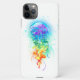 Grande méduse irisée, artistiquement dessinée, brillante, avec de longues tentacules sur le blanc, peinte sur l'arrière - plan multicolore. Méduse arc-en-ciel.