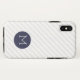 Coque iphone monogramme rayé. monogramme de texte blanc mince classique dans une bordure bleue marine ronde sur bandes minces diagonales en bleu marine.