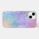 Personnalisé coque iphone élégant et girly avec un arc-en-ciel couleur unicorne gouttant de fausse parties scintillant sur un arrière - plan violet, rose, bleu, vert et orange. Personnalisez avec votre nom dans un script mauve design et tendance avec des swashes.