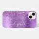 Coque iphone personnalisé élégant et girly avec parties scintillant en faux violet dégoulinante sur un arrière - plan métallique en faux violet. Personnalisez avec votre nom dans un élégant script blanc tendance avec des swashes.