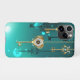 Or, clés antiques avec engrenages et cadrans accrochés sur chaînes dorées sur arrière - plan vert lumineux.