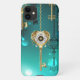Or, clés antiques avec engrenages et cadrans accrochés sur chaînes dorées sur arrière - plan vert lumineux.
