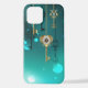 Or, clés antiques avec engrenages et cadrans accrochés sur chaînes dorées sur arrière - plan vert lumineux.