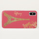 coque Glam iPhone X, avec une parties scintillant aux tons dorés et brillants, en forme de silhouette de la Tour Eiffel, face à un arrière - plan rose corail. Personnalisez le texte doré jaune, pour vous-même ou comme une excellente idée cadeau.