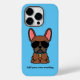 Le dessin présente un joli dessin animé illustrant un bulldog français de couleur faun rouge masculin portant un collier bleu et des lunettes de soleil d'aviateur noir. Police et couleur arrière - plan et être changée.