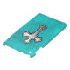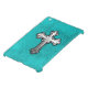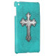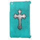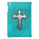 Croix argentée en métal sur un arrière - plan en cuir turquoise