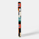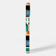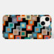 Ce boîtier téléphonique a un design géométrique de carrés à l'intérieur des carrés dans des tons plus clairs de bleu, turquoise, orange, bronzé, blanc cassé, mangue et gris sur un champ de noir.
