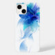 Ce coque iPhone 14 est montré dans une couleur blanche avec un imprimé de fleurs tropicales bleues. Customisez cet objet ou achetez tel quel. Image stock