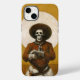 Ce coque iphone est illustré d'un squelette habillé en cowboy de style vintage et dressé contre un arrière - plan d'or chaleureux avec un grand soleil blanc derrière la tête. La tenue comprend un casquette à large bord, un foulard et une ceinture de fusil avec des munitions. L'original est peint en acrylique sur coton.
