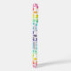 coque iphone avec un joyeux motif de couleur arc-en-ciel des icônes liées au théâtre sur arrière - plan blanc, avec des masques de théâtre couleur aqua dans un cercle où vous pouvez ajouter un nom, date, initiales, etc. pour personnaliser ce coque pour votre amateur de théâtre préféré. Parmi les icônes : Shakespeare, masques de théâtre, microphone, notes de musique, chaise de réalisateur, billets, étoiles, rideaux de scène, projecteur, rose, et plus encore.
