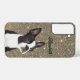 Un étui téléphonique doré qui peut être customisé avec n'importe quel nom. Il présente un adorable Boston Terrier et est un cadeau parfait pour l'amoureux des chiens.