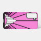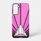 Un motif de style art déco classique, créé en rose. Un motif emblématique du soleil se levant derrière un bâtiment en forme d'art déco stylisé. Un design simple mais élégant, fidèle à l'époque.